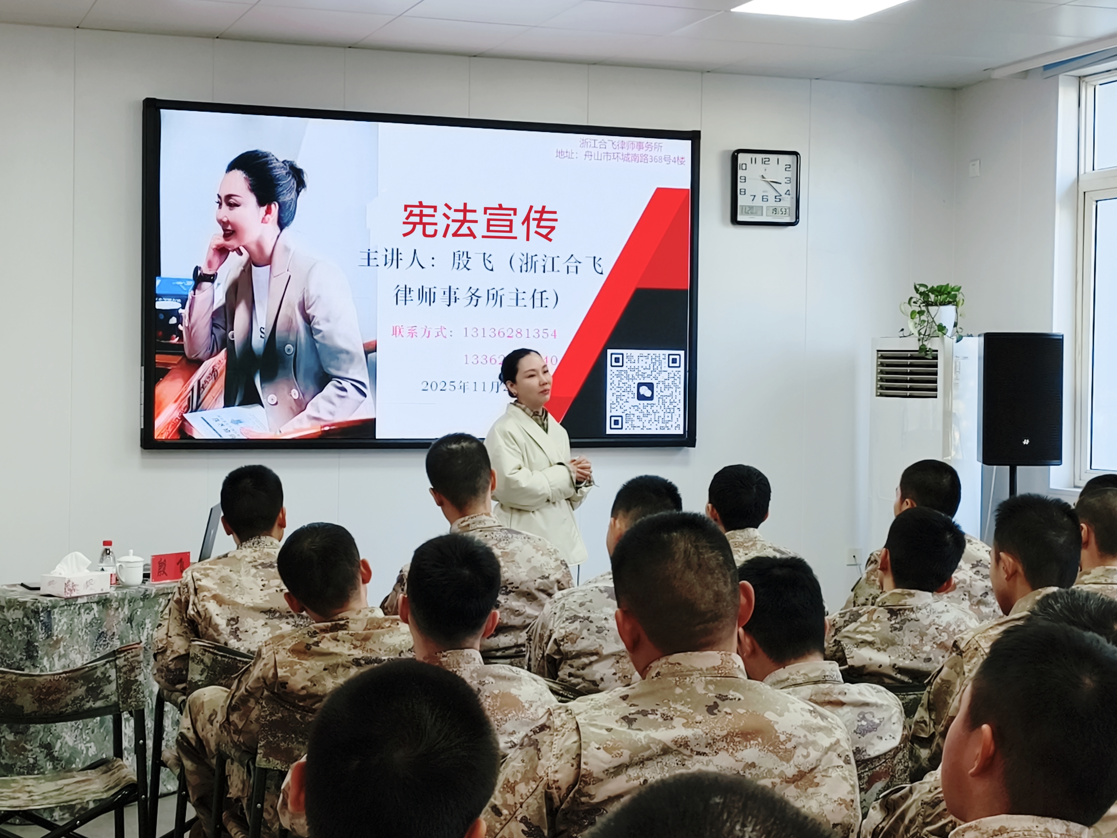 在12月4日国家宪法日来临之际,为深入弘扬宪法精神,让“根本大法”走进群众生活,浙江合飞律师事务所殷飞、周晓和两位律师受邀为部队官兵开展宪法宣传专题讲座,以专业视角解读法律知识,为现场官兵送上实用法治“干货”。