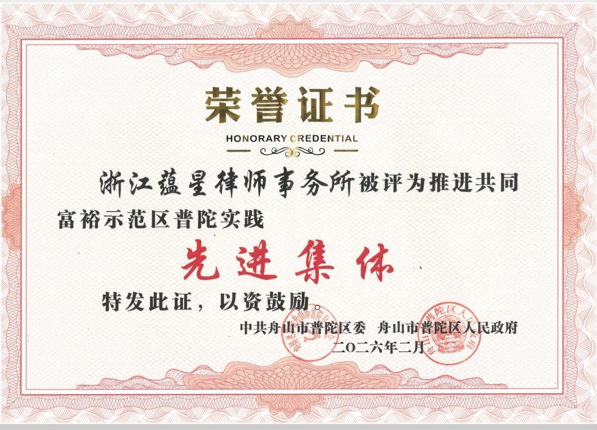 近日,浙江蕴星律师事务所荣获“推进共同富裕示范区普陀实践先进集体”荣誉。