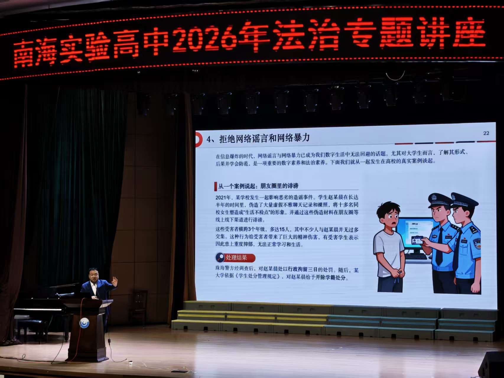 为进一步增强青少年的法治意识,助力学生健康成长,3月23日,浙江震舟律师事务所的王曾律师应南海实验高中邀请,为在校高中生开展了一场主题明确、案例鲜活的法治专题讲座。